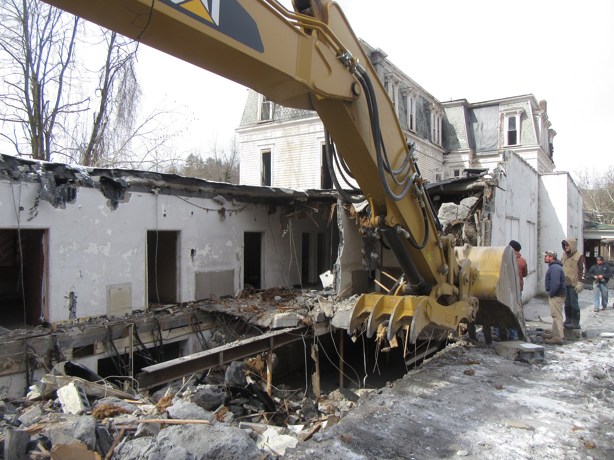 It was a sad sight for many residents of Meshoppen on Wednesday afternoon as an excavator tore into the backside of the old Tyler Hospital. For others, it was a sign of progress. The larger part of the building was constructed about 125 years ago as the Kennard Hotel and served most recently as the KenMar Furniture Store. New owner Bill Ruark intends to construct a truck and car wash on the property after the demolition is complete.