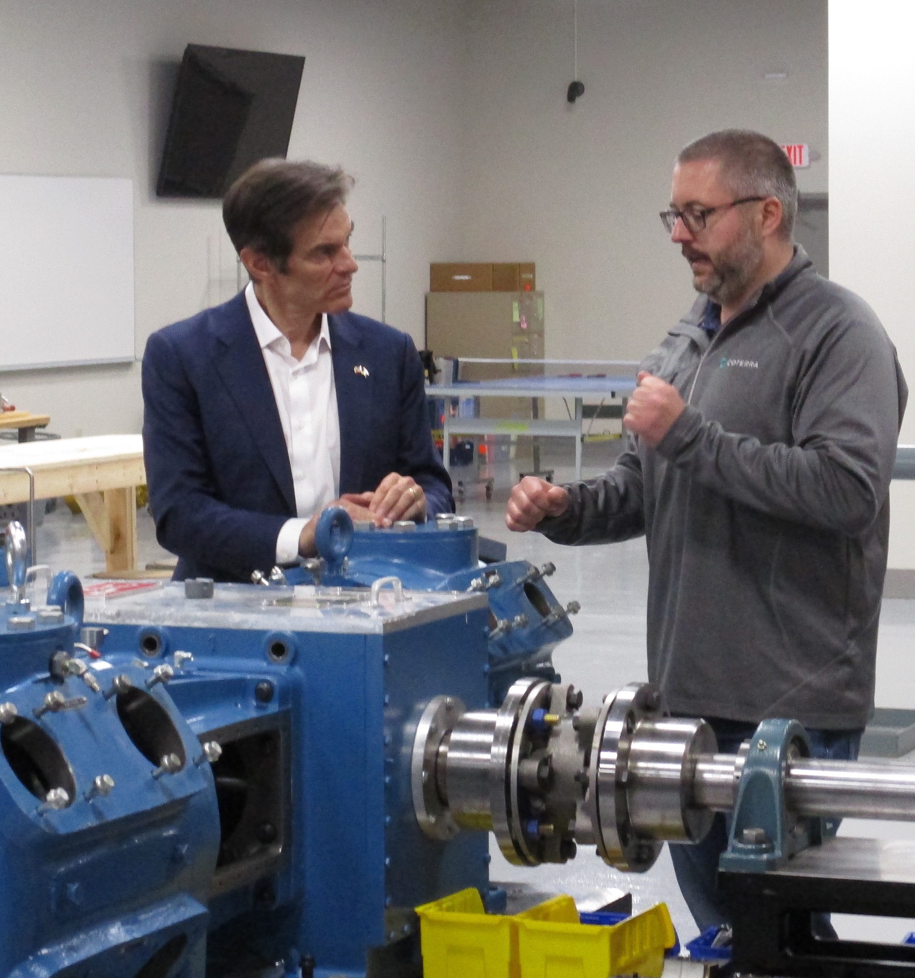 Bill desRosiers of Coterra (right) shows Dr. Mehmet Oz around the heavy equipment lab at the Lackawanna College School of Petroleum and Natural gas on March 28.