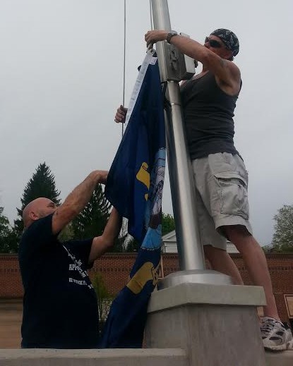 Roy Schrimp (left) of the Marine Corps League Detachment 445 Towanda and Don Richardson of AmVets Post 187 Towanda/Wysox assisted with the first official changeover of flags at Bradford County Veterans Memorial Park since the groundbreaking dedication ceremony a year ago. Both are also members of the VFW Beirne-Webster Post 1568 Towanda, which donated the new flags.