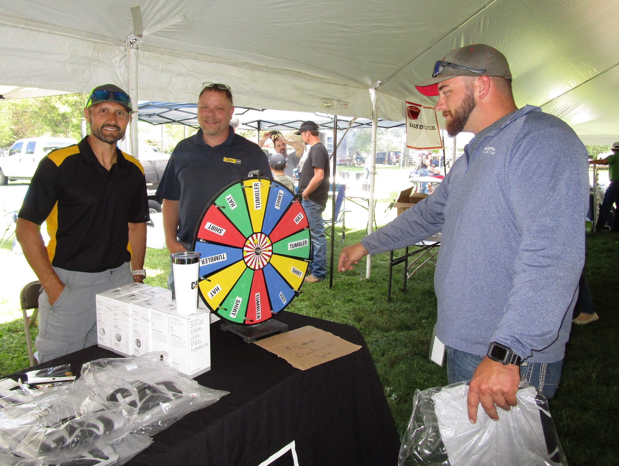 Jimmy O’Brien (right) of Williams gives the prize wheel presented by Cleveland Brothers a spins as crew members Matt Fowler (left) and Phil Moser look on.