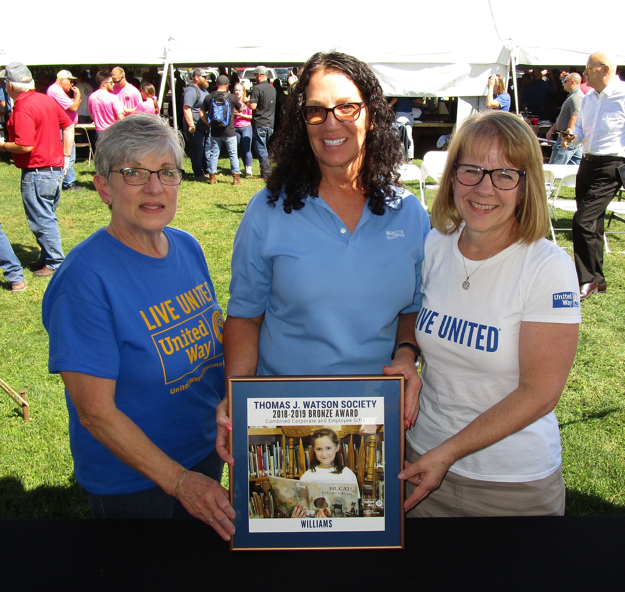 Too Sauced to Pork, comprised of Williams Companies employees, took first place in the “pulled pork” category at the annual William’s Company Barbecue Cook Off held at Lazy Brook Park in Tunkhannock on Sept. 20. Members included (top, front, from left) Andrew Thomas, Delton Trosky, Benjamin Pippenger, Tammy Bonnice, (back) RJ Bartolai, Bill Howard, Mitchell Diltz, Sean Manzoni, and Owen Ferik. United Way representatives Susan Newcomb (left) and Lorianne Welch (right) present Tammy Bonnice of Williams Companies a plaque in appreciation of the funds generated through the years by the barbecue cook off.