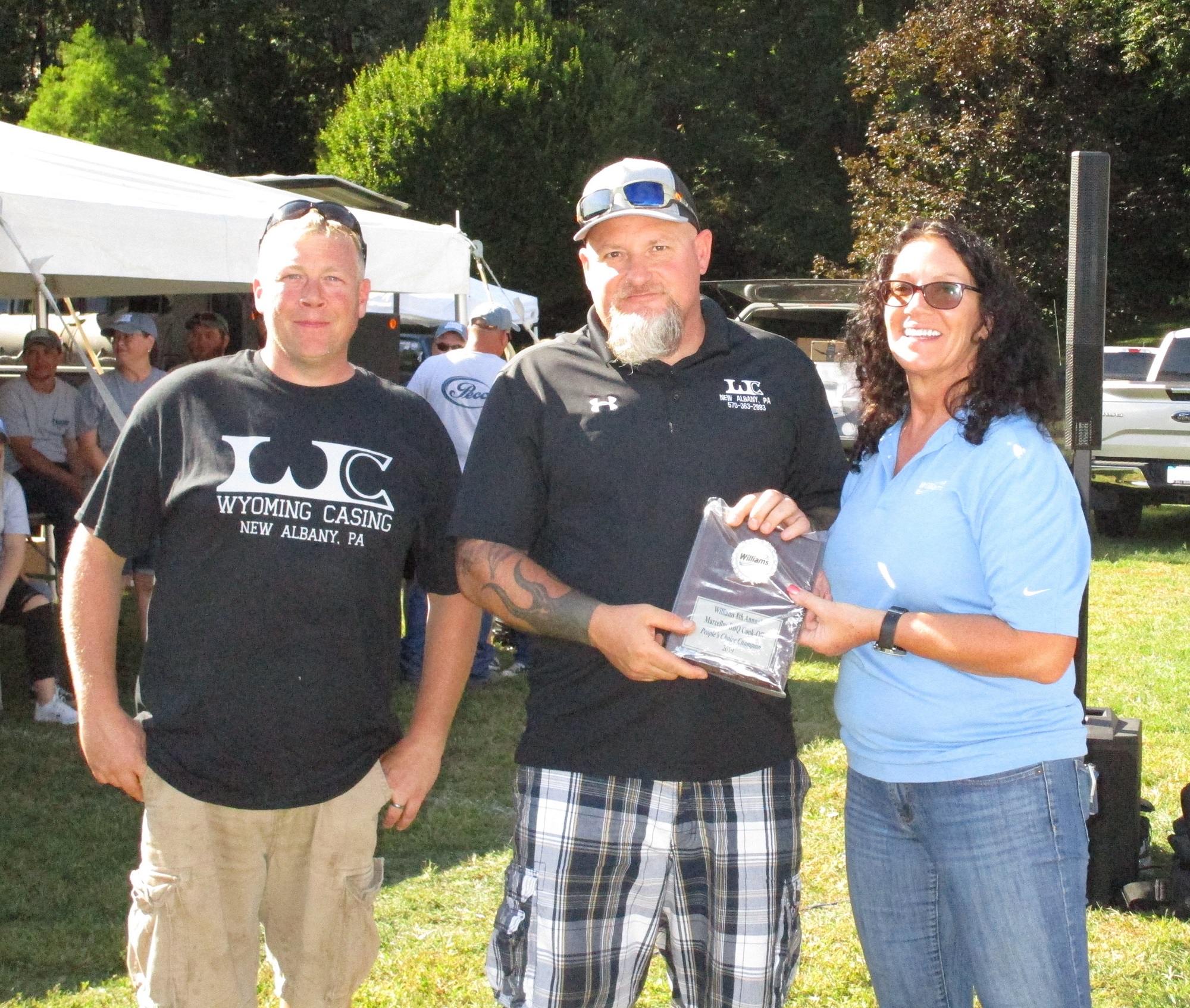 Tammy Bonnice of Williams (right) presents the People’s Choice Award to Bruno Day and Steve Brown of Wyoming Casing Services of New Albany.