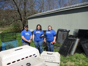 Williams employees (from left) Ben Pippenger, Alisha Polzella, and Tammy Bennett didn’t mind the dirty work of cleaning out a storage shed full of animal carriers and crates at Blue Chip Farm during their recent ‘Volunteer Week.’