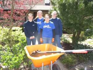 Weeding and mulching landscape beds at Blue Chip Farm were (from left) Samantha Hadlock, Megan Karhnak, Carlene Starkey, and Amanda VanTyle.