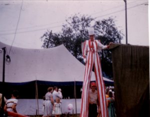 1953 WVFC president and former circus performer Harry Sills (above) walks on stilts during the 1954 V-J Day carnival.