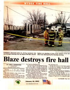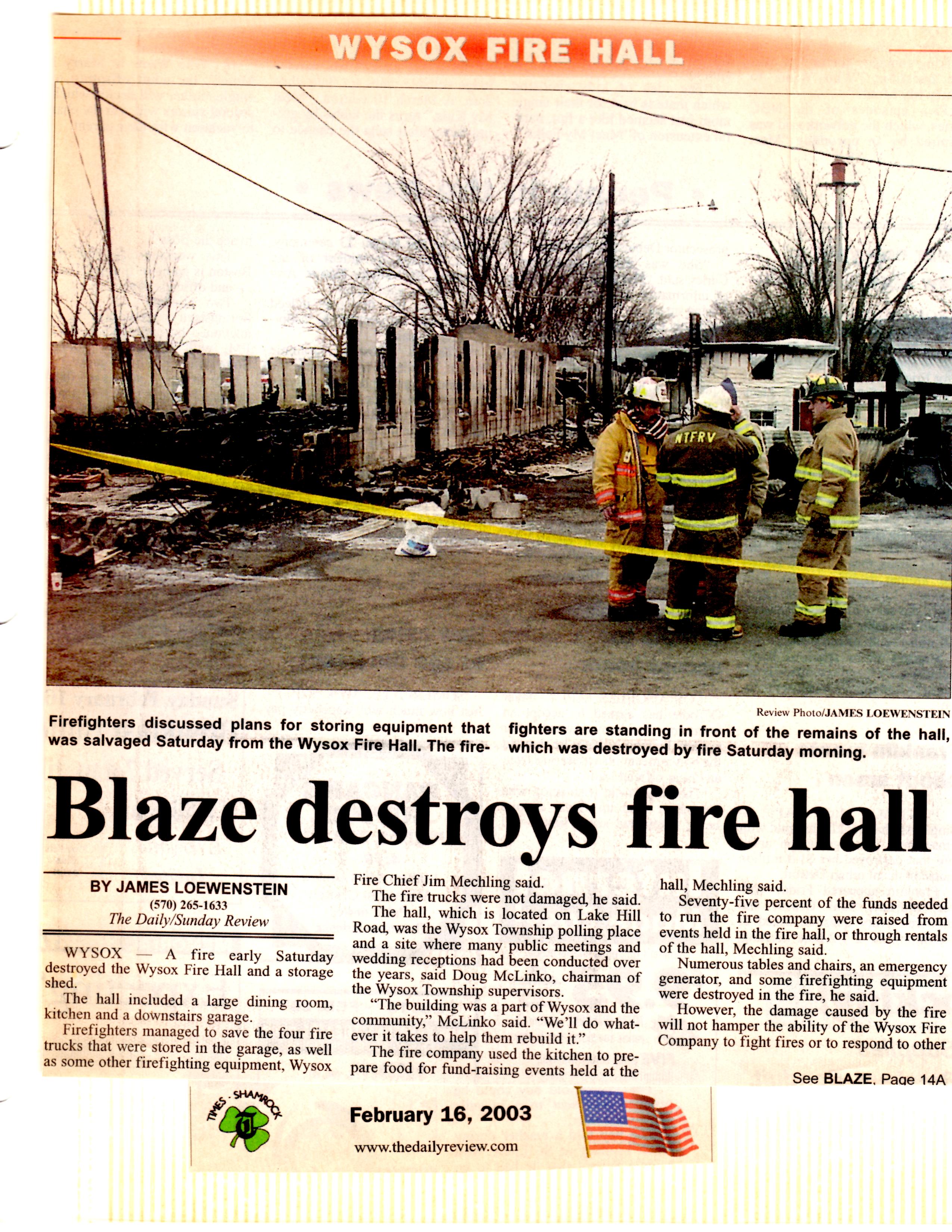 For all of its years of protecting the greater Wysox community from fire loss, WVFC suffered an almost unimaginable disaster of its own on February 14, 2003. In the early morning hours, the hall, which included the kitchen, dining room, and downstairs garage, went up in flames. Firefighters were able to get the trucks and some additional equipment out of the garage, but the building was otherwise a total loss.