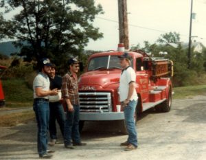 Ken Ackley, Tim Secules, Tom Dixon, and Jeff Benjamin relax on the fire company grounds during a 1984 open house.