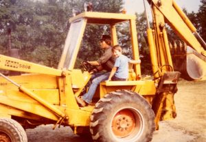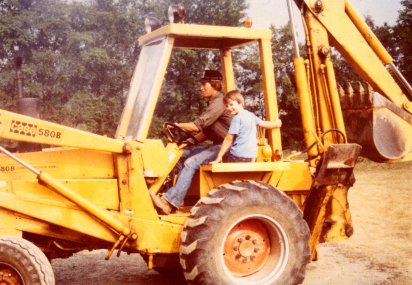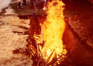 First, a pit four-feet-wide, four-feet-deep and 16-feet-long was dug, as seen in the above photo from 1981 with Gene Beers driving the back-hoe and Jimmy Roof riding along. A truckload of hard wood was loaded into the pit and left to burn overnight (below) into a three-foot layer of hot coals.
