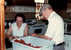 Pearl and Willis Jennings (above) were two of many helpers that cut up 140 quarts of strawberries for strawberry shortcake in 1984.