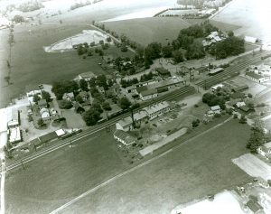 This aerial view of the intersections of Route 6 and 187 in Wysox was taken after the construction of the ball field in 1949 but before the construction of the firehouse in 1955.