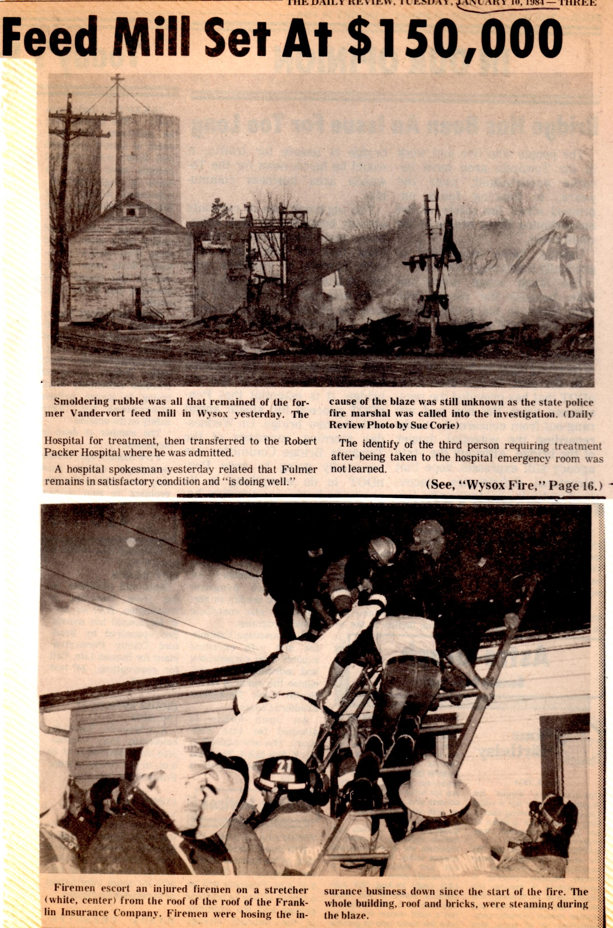 Firefighters were again handicapped by bitter cold in January 1984 when Vandervort Mills went up in flames. Companies from Wyalusing, Towanda, Rome, and Monroeton helped to battle the conflagration which threatened to ignite several nearby structures. Witnesses reported seeing rats running in large numbers from the buildings, the Tim Franklin Insurance building (above) steaming as hoses were trained on it to prevent it from igniting, and water freezing quickly on every surface that was away from the heat.